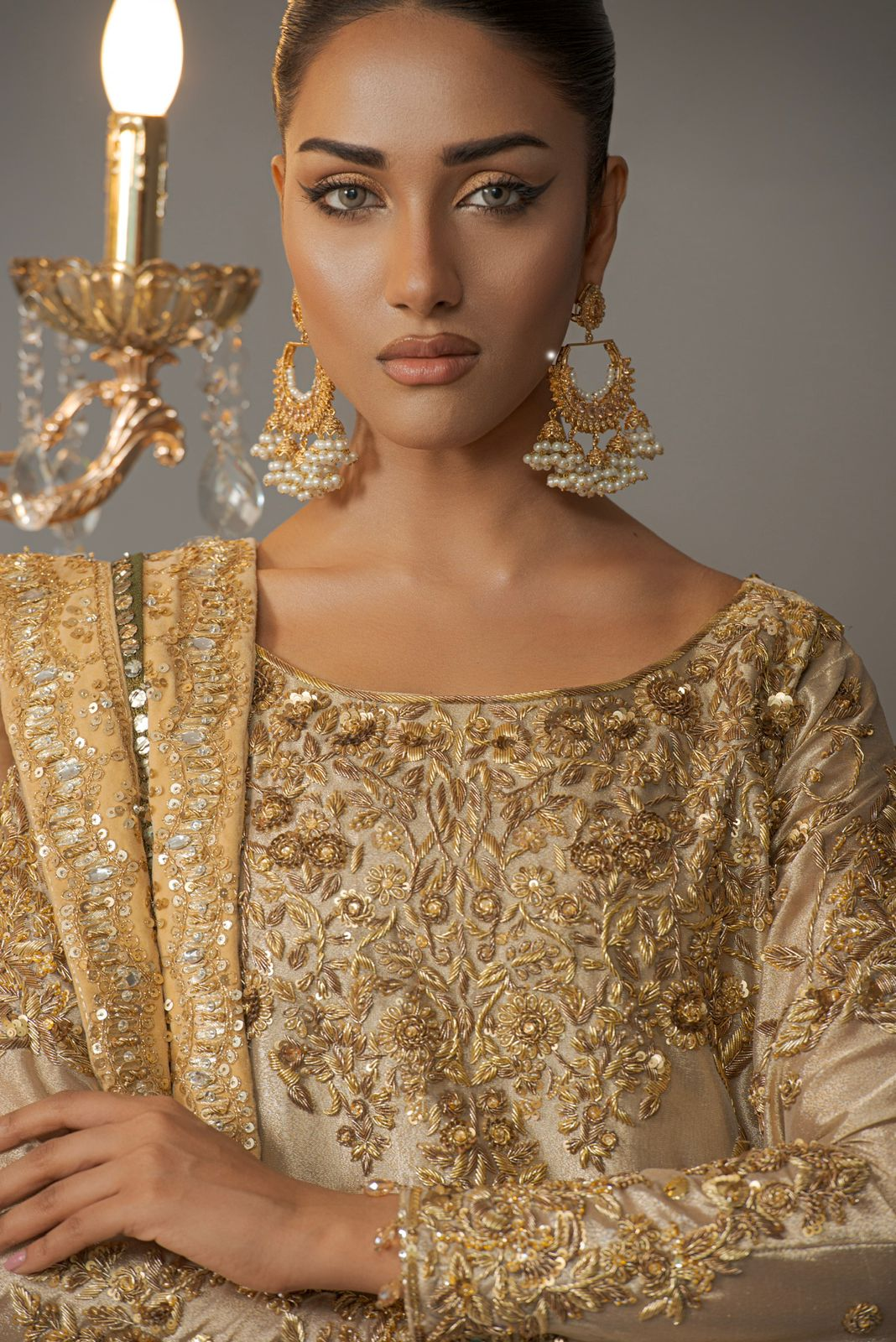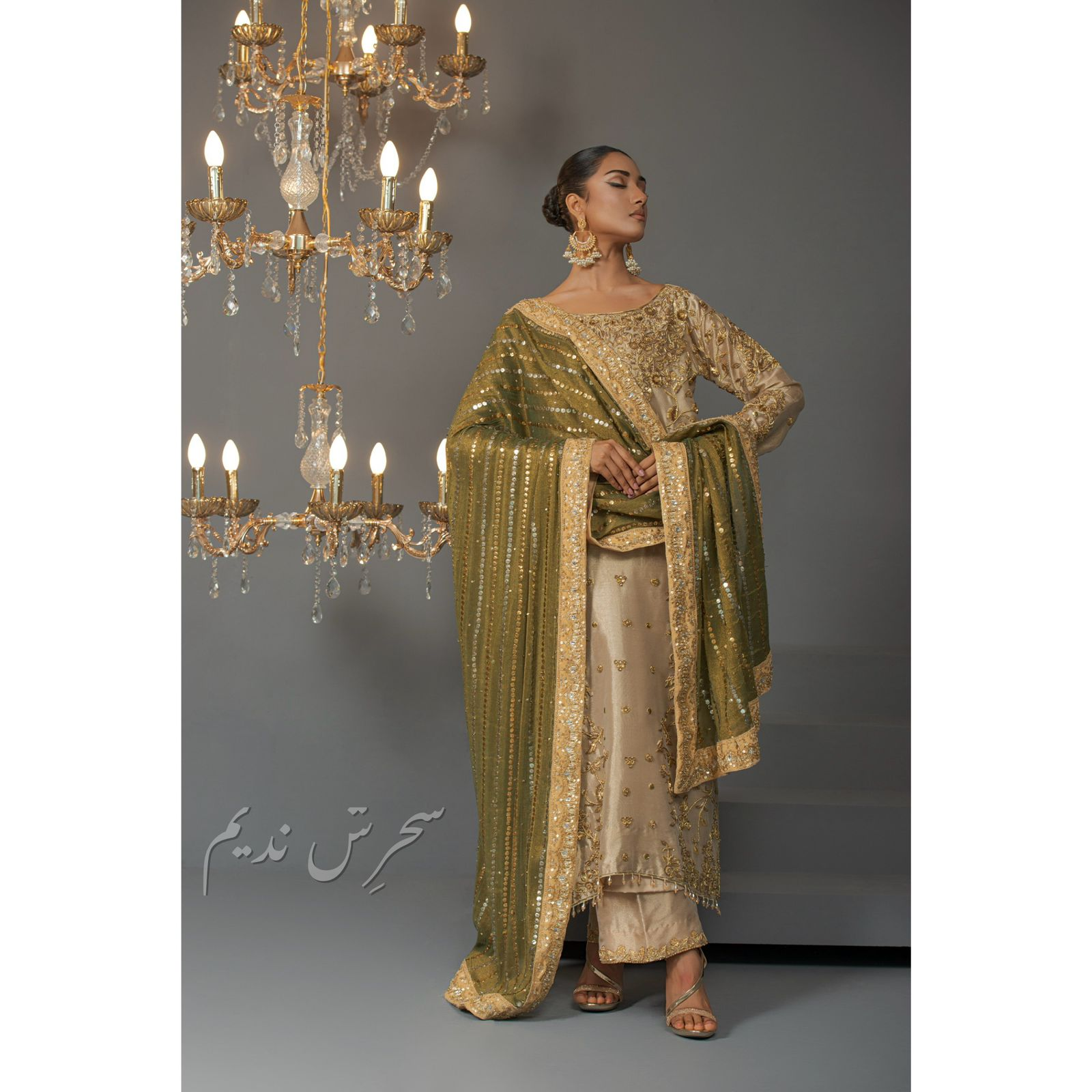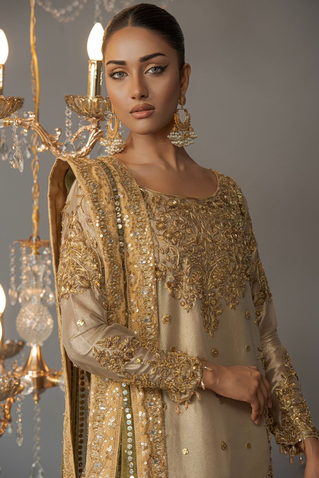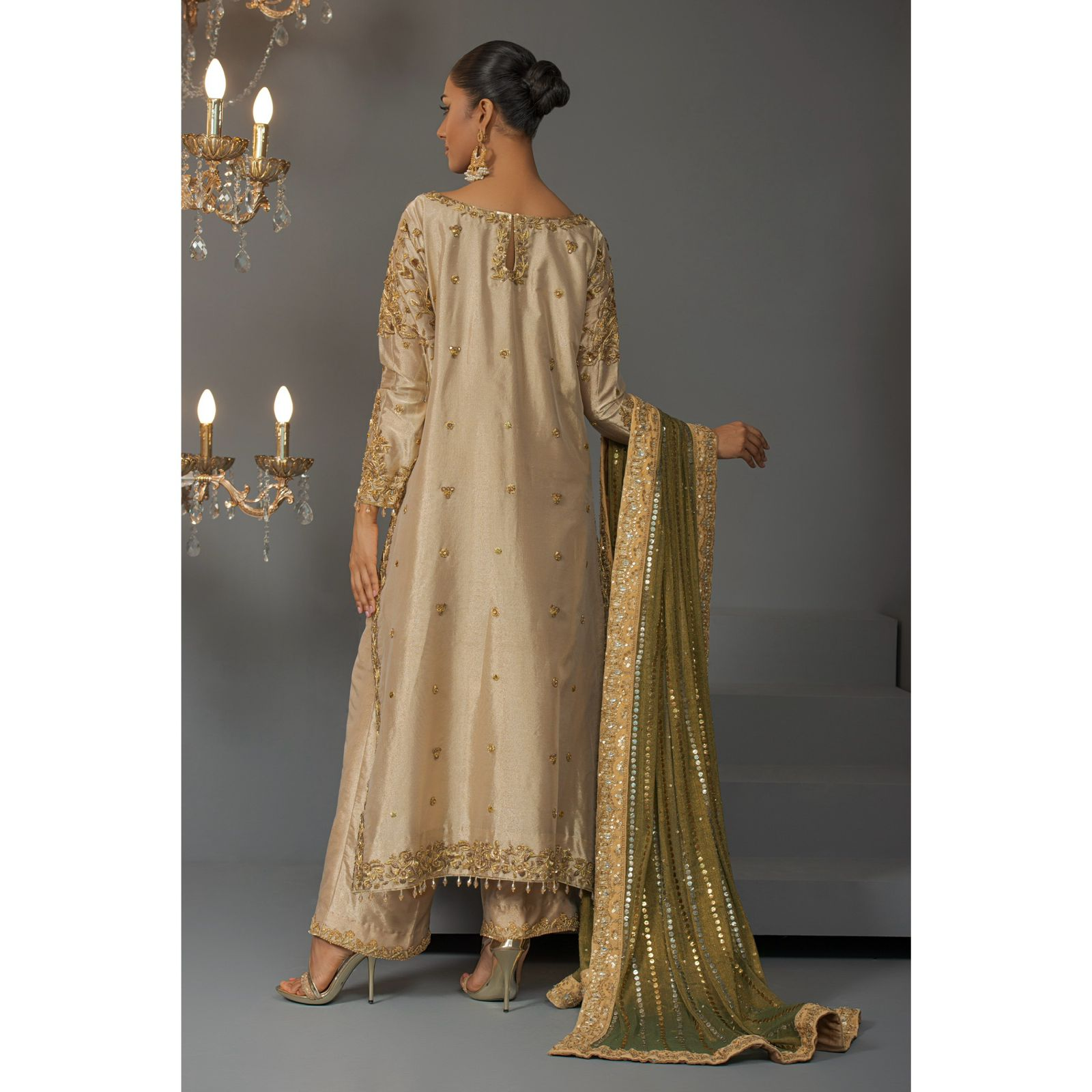 This vibrant gold and green ensemble features a long shirt with a mukesh and zardozi work dupatta and azar pants. The refined zardozi work with mukesh and beading details give it a timeless appeal and for any occasion.