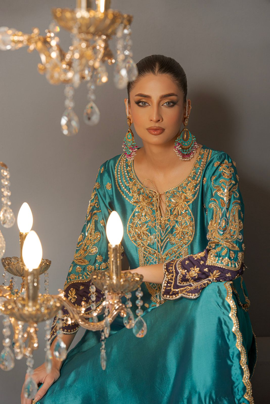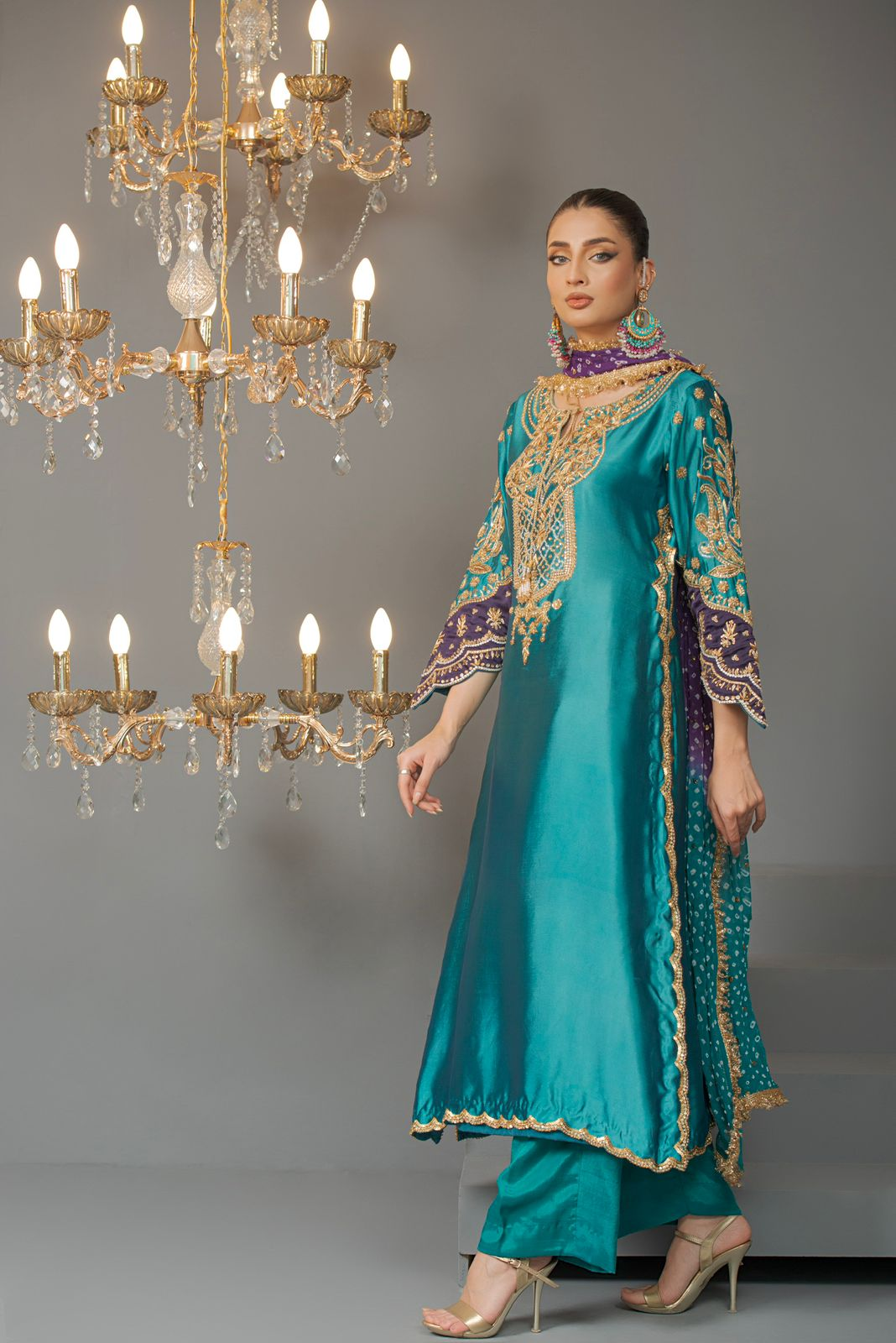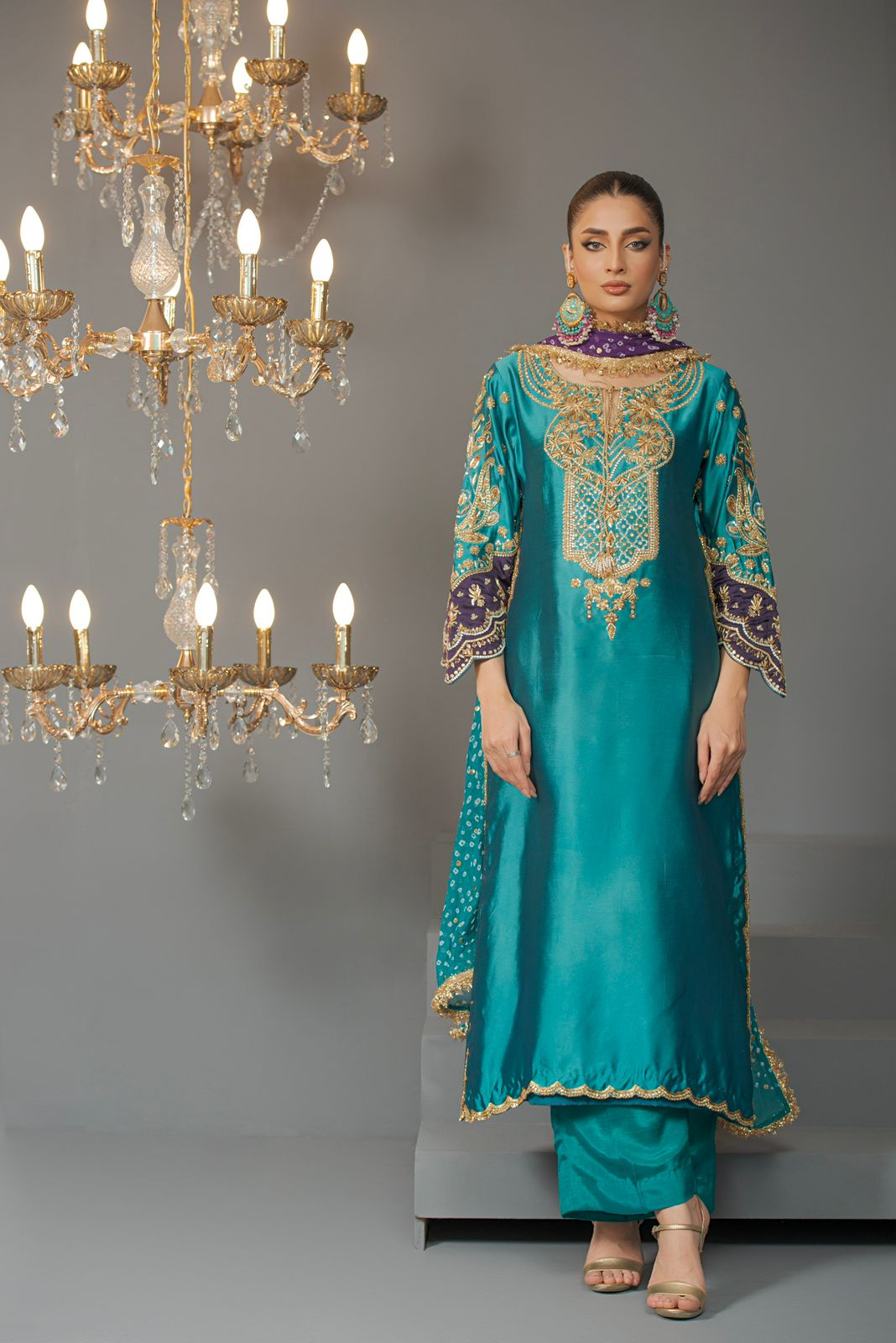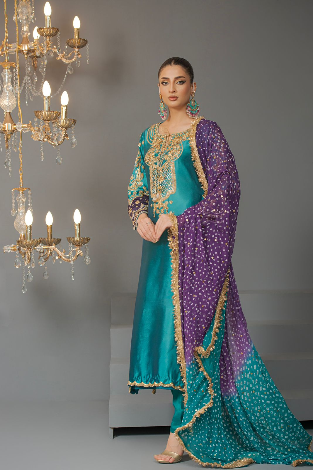 Top – pure sheesha silk -Bottom – Raw Silk Dupatta – chunri chiffon aesthetically appealing composition is portrayed on this classy ensemble rendered in a blue and purple hue, with embroidered neckline and crystal details, paired with, loose-fit pants, and chunri chiffon dupatta.