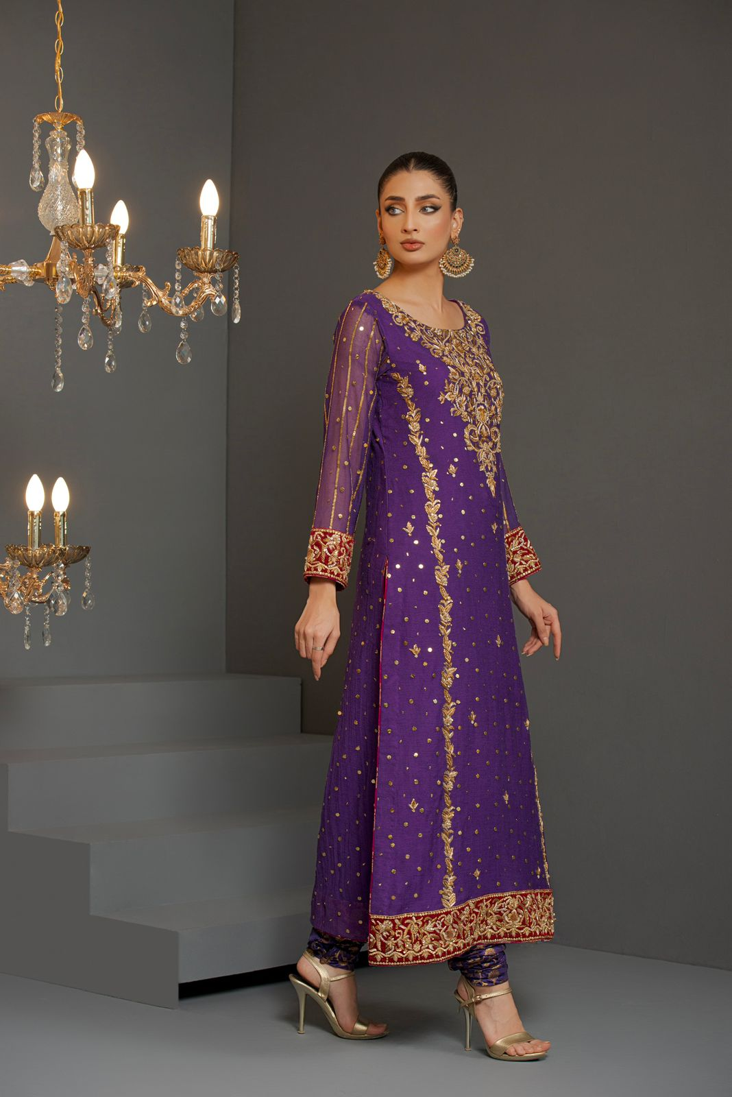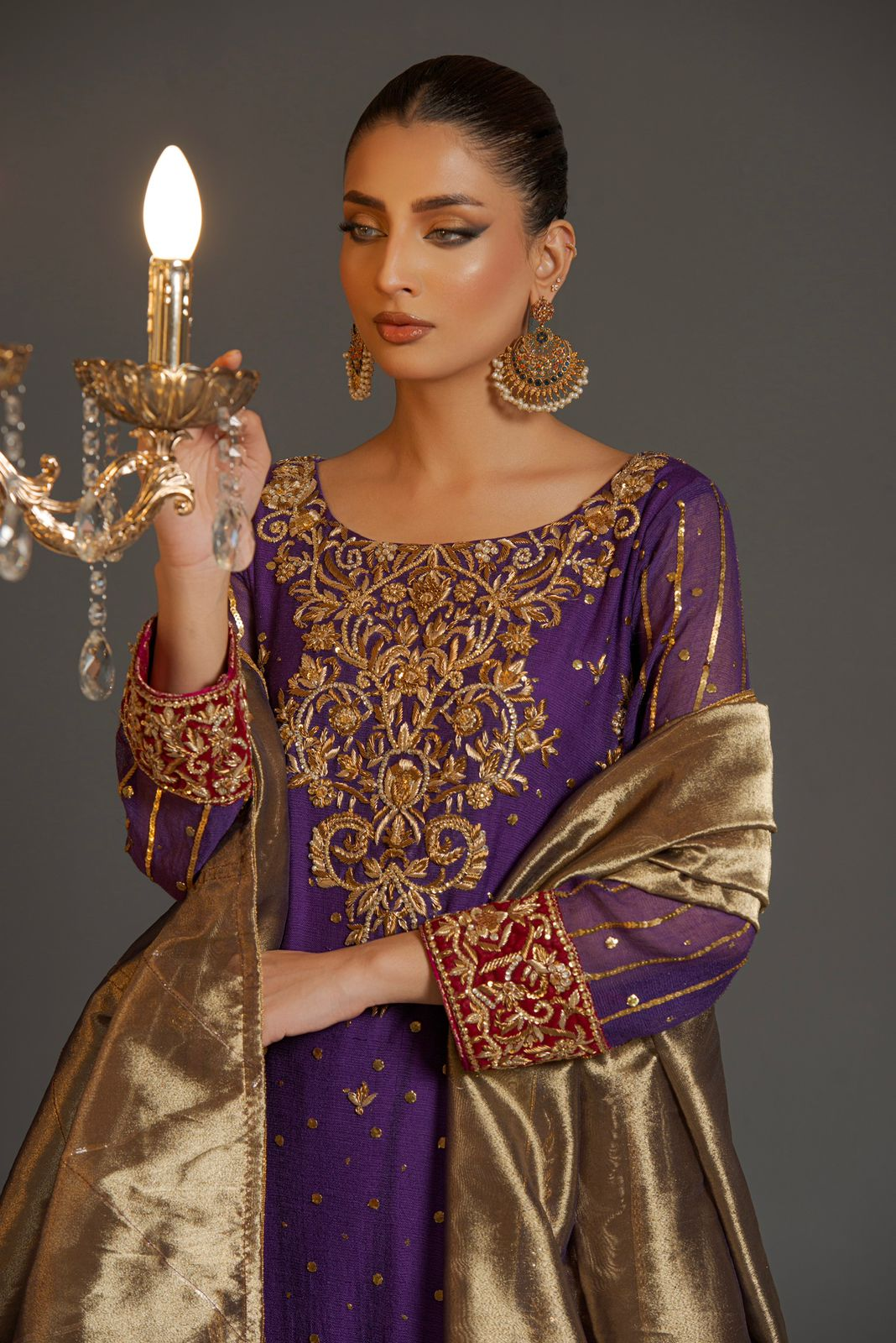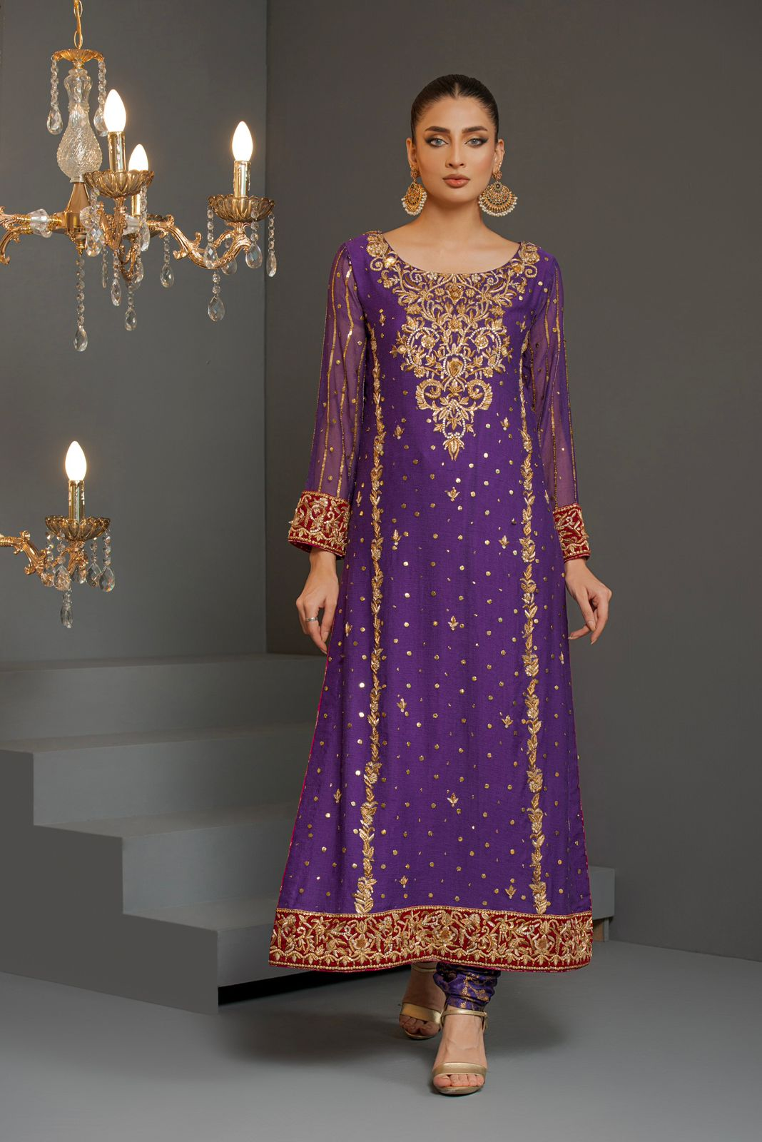 This alluring look features a mukesh embroidered shirt with pink applique details and is paired with a churidar ,lama tissue dupatta with gotha finish. Price £250