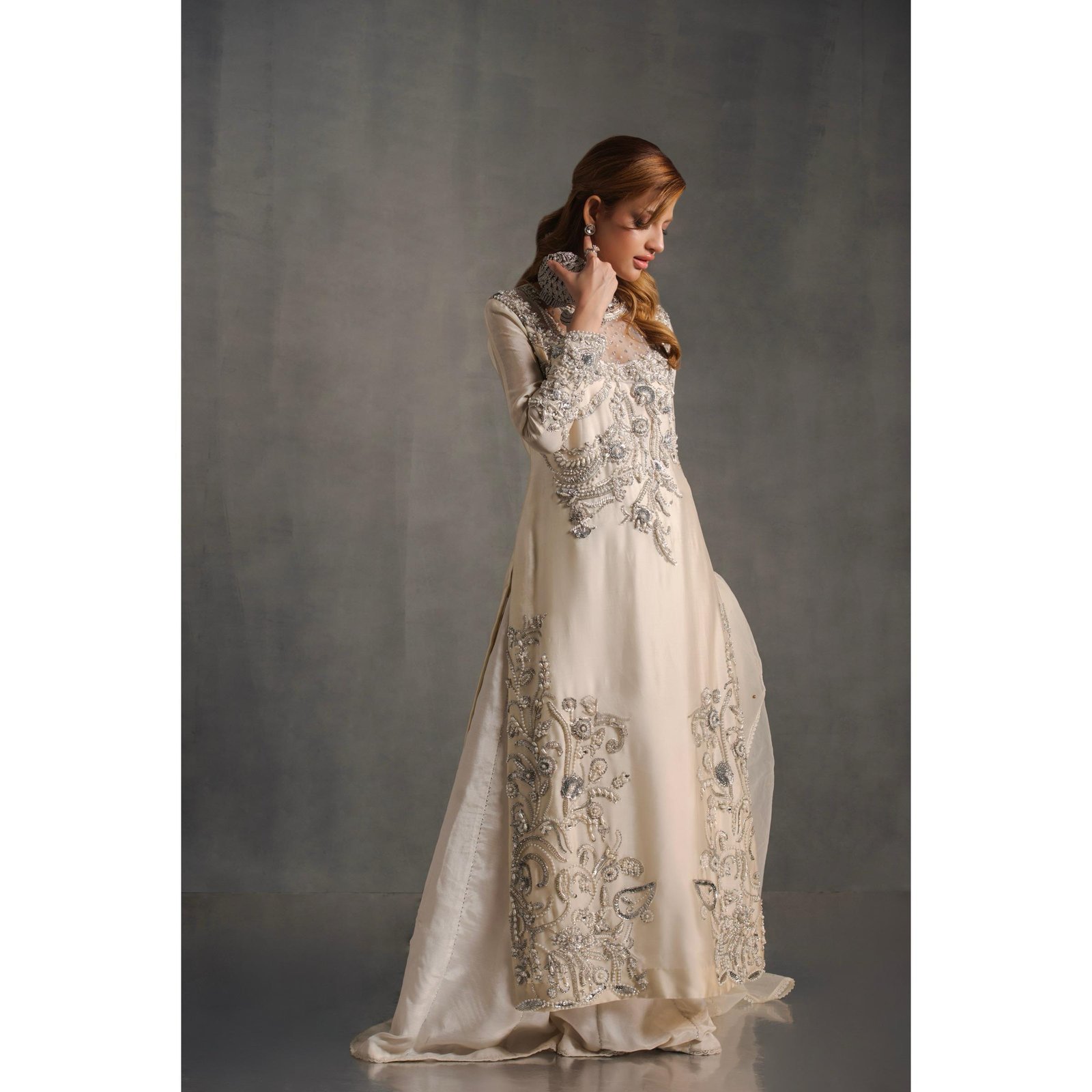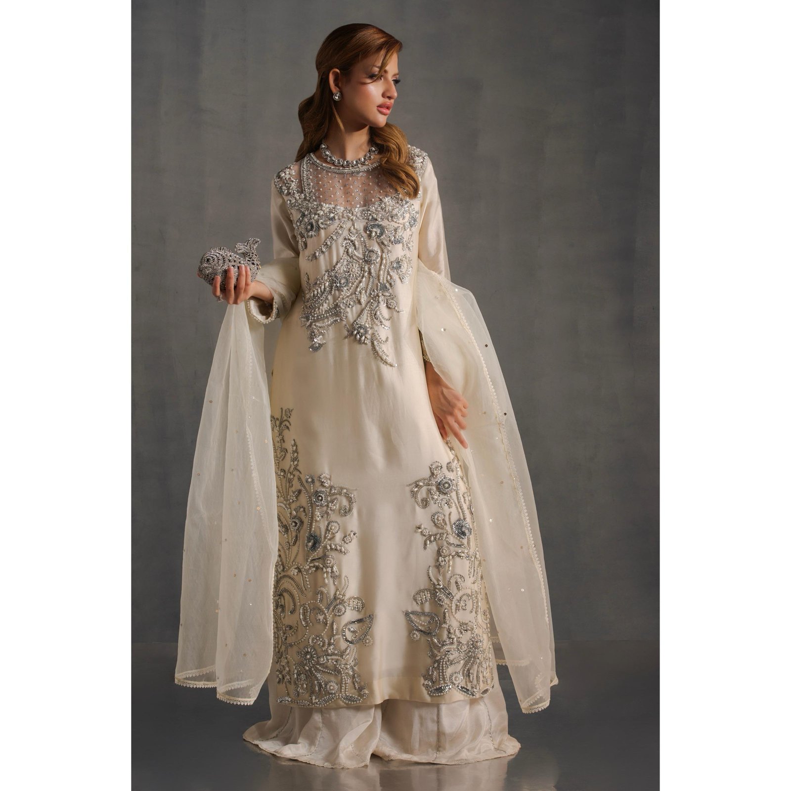 A vision of grace, this relaxed silhouette is rendered in a moonlit ivory hue, adorned with intricate embroidery in crsytals and diamontee . Crafted from whimsical sheesha silk lined with crepe, the delicately embellished ensemble exudes timeless charm-