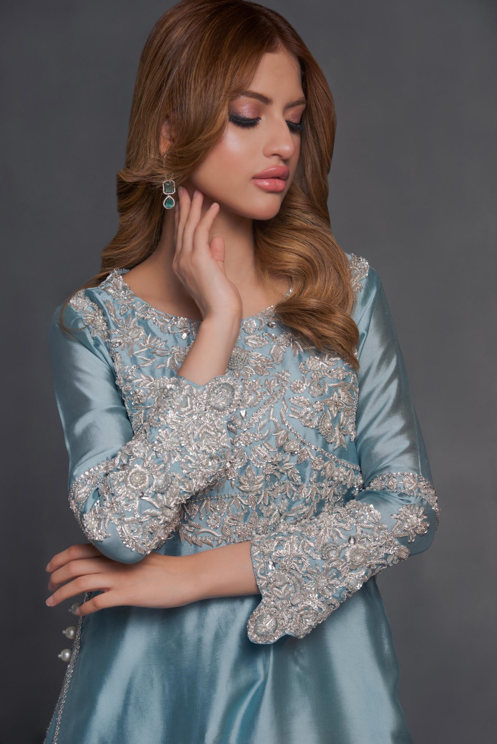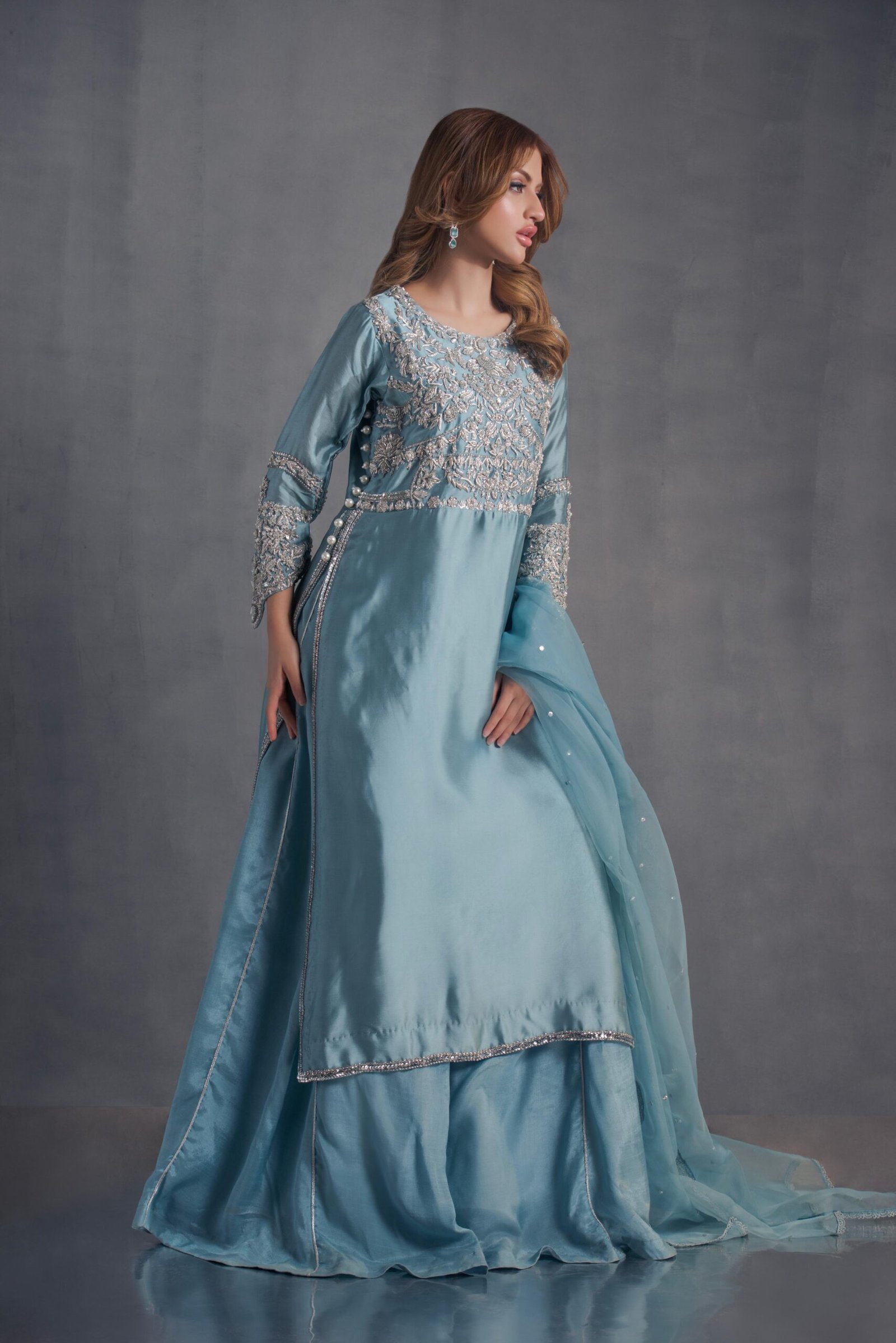 This gorgeous elsa blue sheesha silk ensemble is sure to turn heads! With a beautiful embroidered bodice and details in sleeves , this silhouette will surely be a staple in your wardrobe.