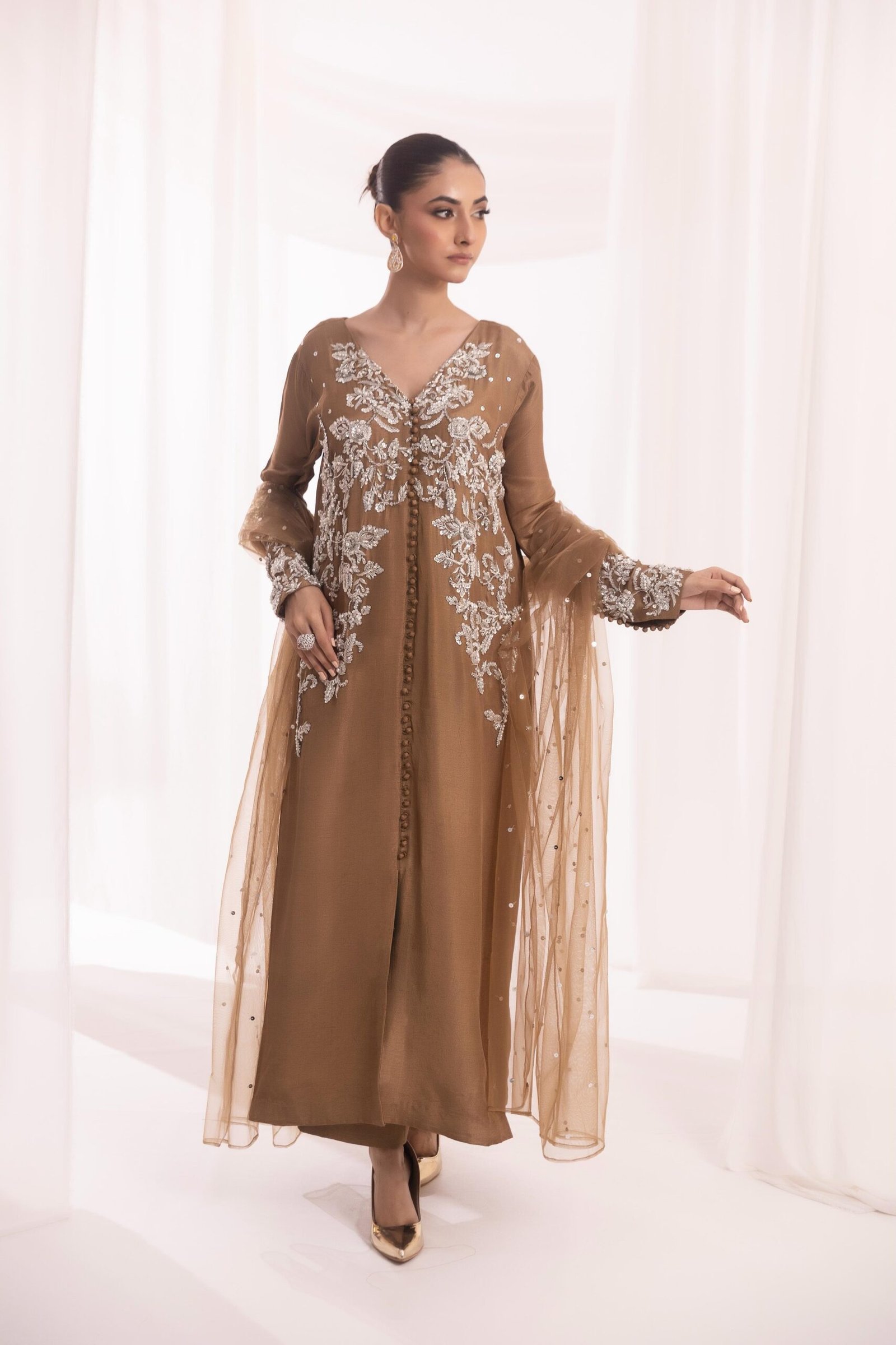 This coffee-brown long dress is adorned with intricate white floral embroidery, delicate pearl details, and sheer flowing layers that exude timeless sophistication. Perfect for soirées and festive evenings, it blends tradition with modern finesse.
