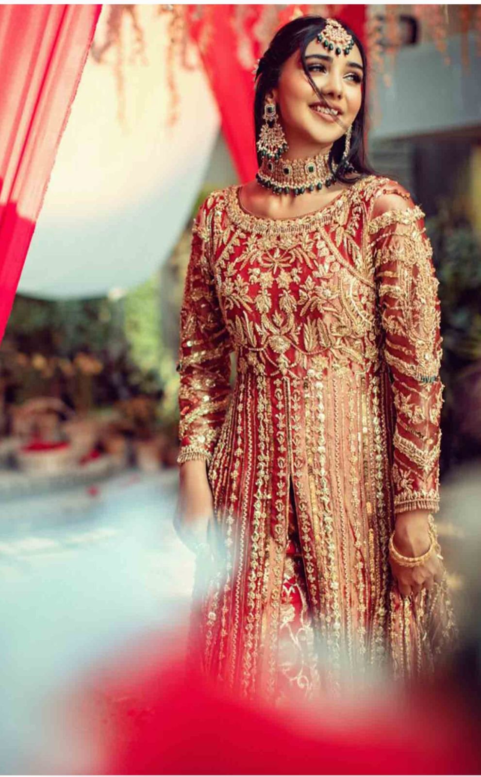 ‘Ayzel’ is rendered in a celestial rust hues With its glamorous draped silhouette a delicately embellished gown , you’ll make a dramatic statement this festive season. Dupatta with a heavy zardozi one side border with 3 side sequence scallope border
