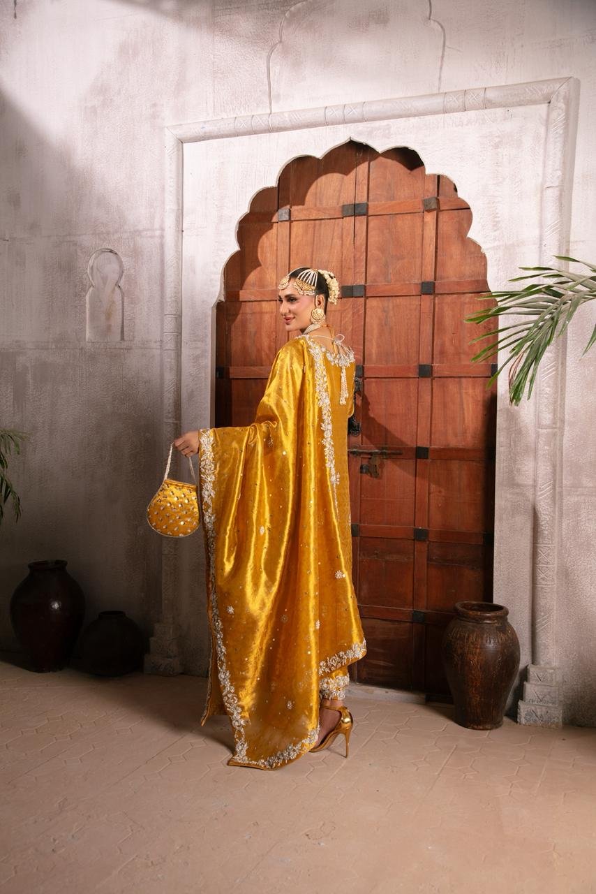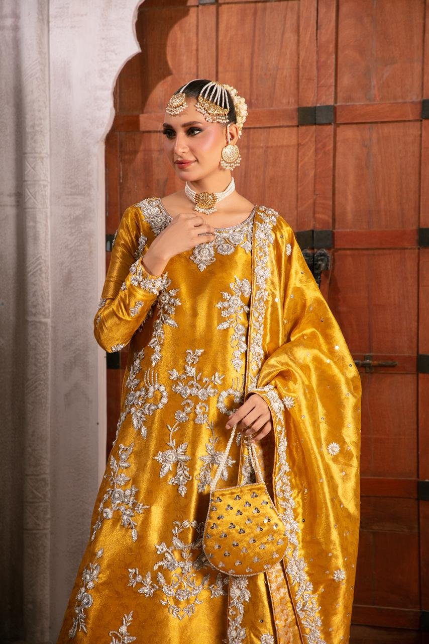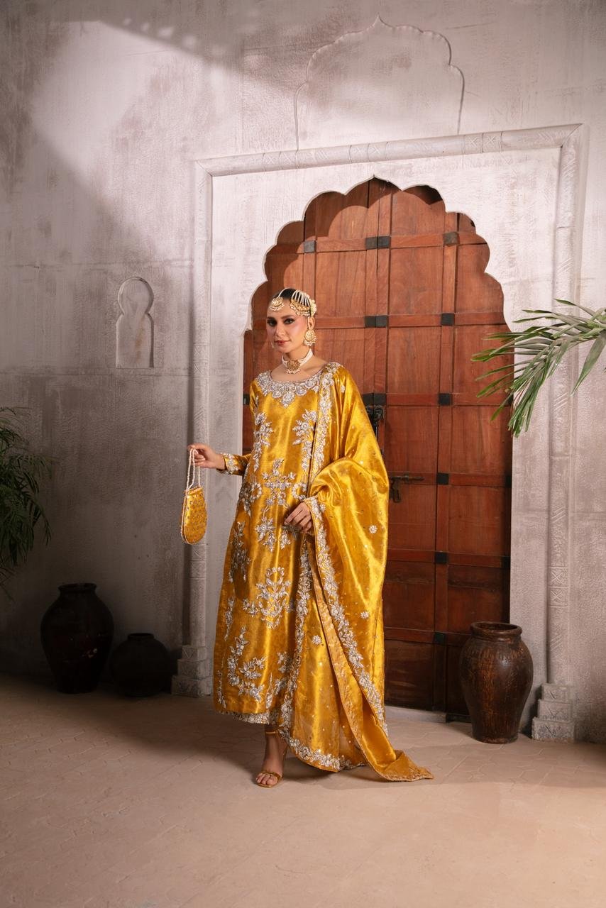 An ode to timeless elegance and regal artistry. This exquisite mustard golden lama ensemble is adorned with intricate silver zari and dapka embroidery, creating a perfect balance between royal grandeur and modern grace. The rich texture of lama drapes effortlessly, while the handcrafted embellishments reflect the charm of old-world craftsmanship.