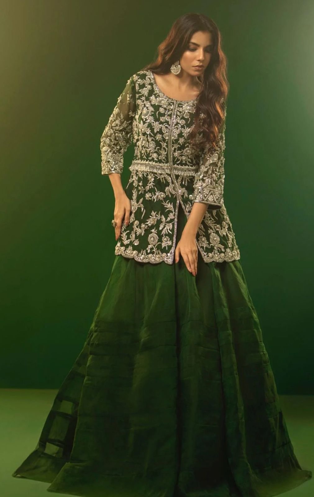 A quintessential look, this beautiful formal features a medium length peplum shirt with sparkling details with exquisite layered lehnga. Standard Sequence (Chun)Spray Dupatta This is a 3 Piece stitched outfit.