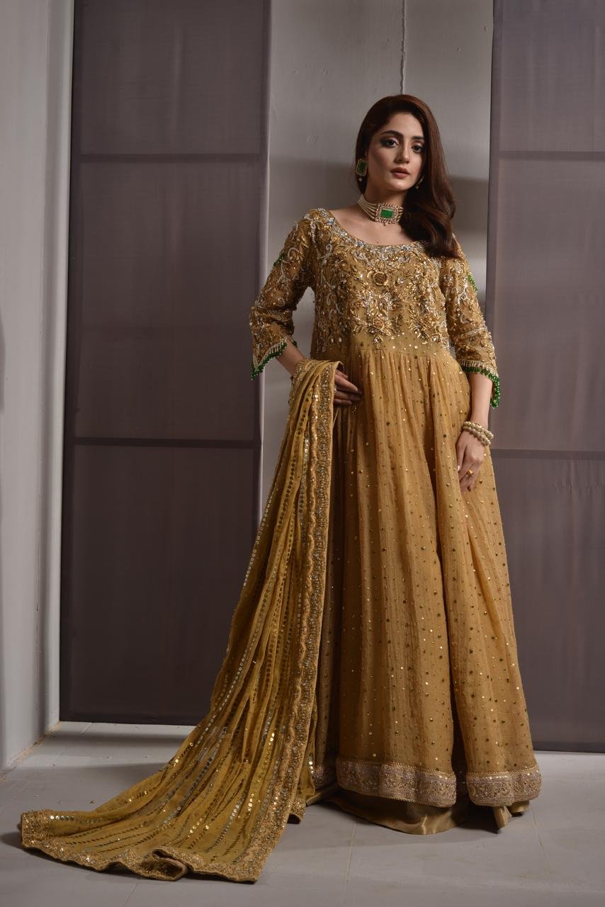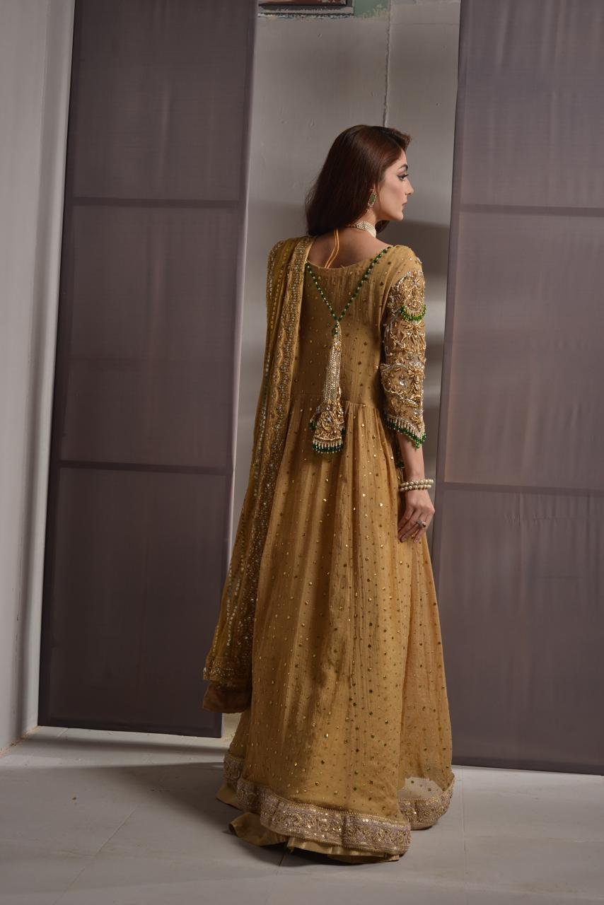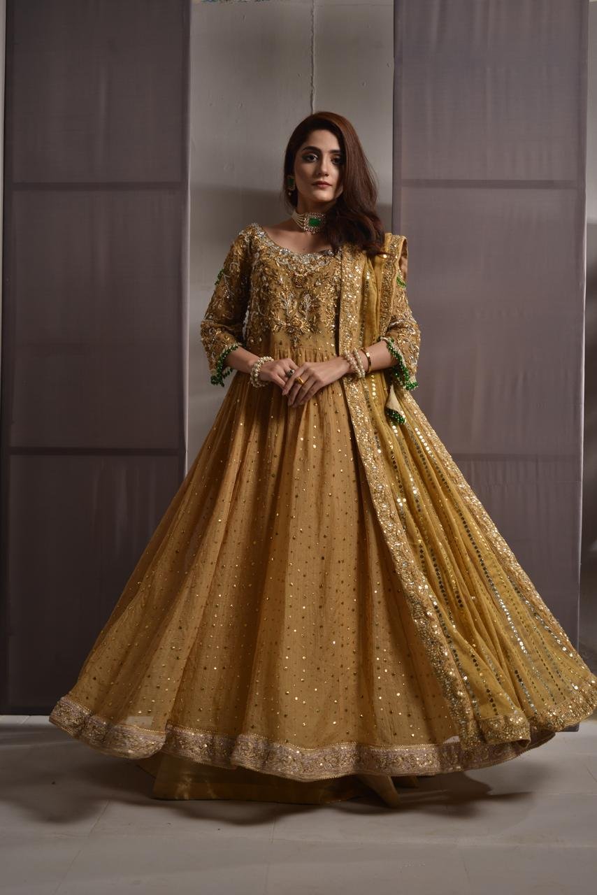 This old school golden beige heirloom adorned with intricate embroidery and embellished with kamdani,zardozi, crystals -Paired elegantly with tissue skirt, this ensemble features a dupatta with enchanting borders highlighted with gotha and sequins,and mukesh heavywork-