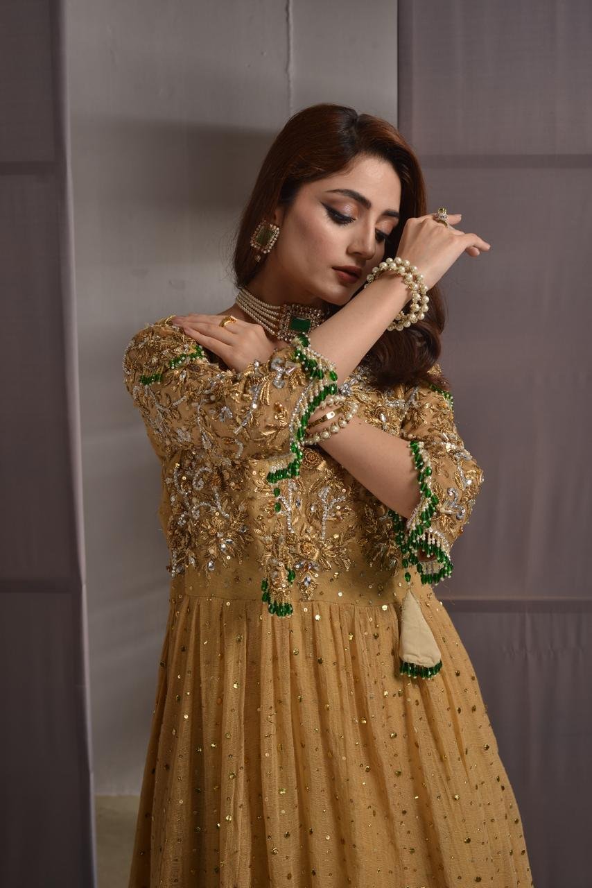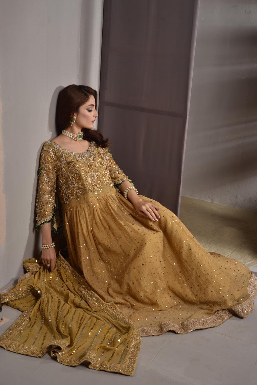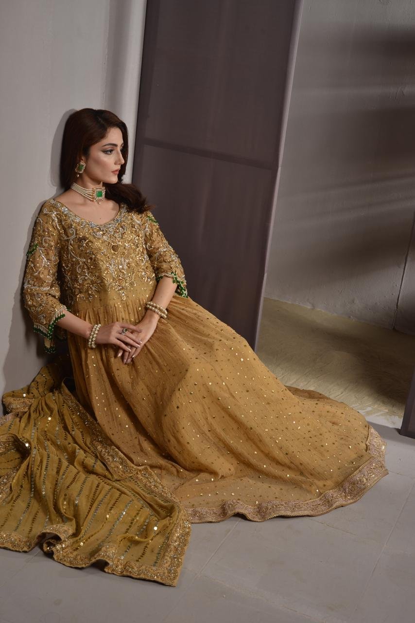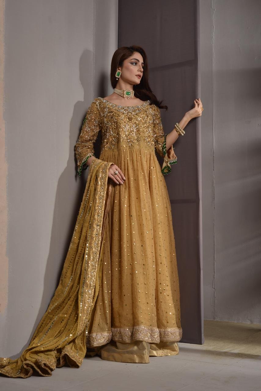This old school golden beige heirloom adorned with intricate embroidery and embellished with kamdani,zardozi, crystals -Paired elegantly with tissue skirt, this ensemble features a dupatta with enchanting borders highlighted with gotha and sequins,and mukesh heavywork-