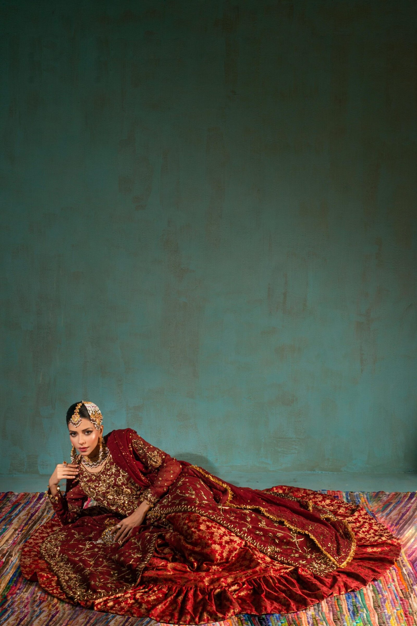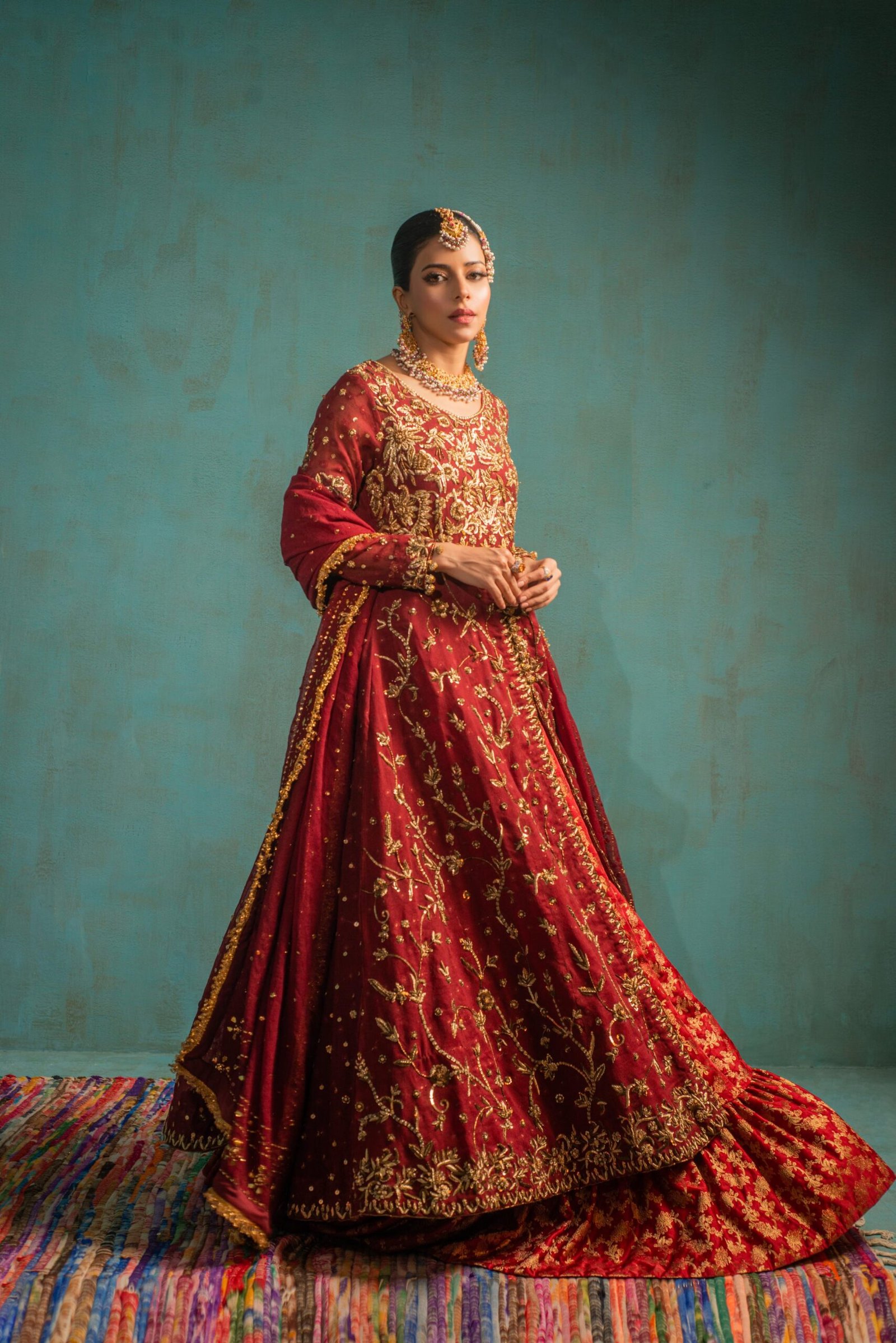 Draped in deep maroon cotton net, this exquisite ensemble is a celebration of heritage and elegance. Intricately hand-embroidered with antique gold zari, tilla, and resham, the outfit reflects the grandeur of classic craftsmanship. The flared silhouette features delicate floral vines cascading throughout, while the hem and sleeves are accentuated with richly detailed borders. Paired with a matching dupatta adorned with scattered motifs and scalloped edges, this look is perfect for a bride who cherishes old-world charm. Styled with traditional kundan jewelry and a graceful posture, the look is completed with understated poise and timeless beauty